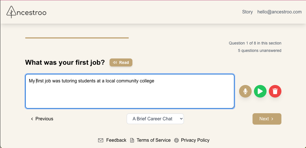 Ancestroo is a guided journal for documenting and sharing your life story with your loved ones. Next.js with NextAuth.js, Resent, Stripe, jsPDF, FFmpeg, and AWS.